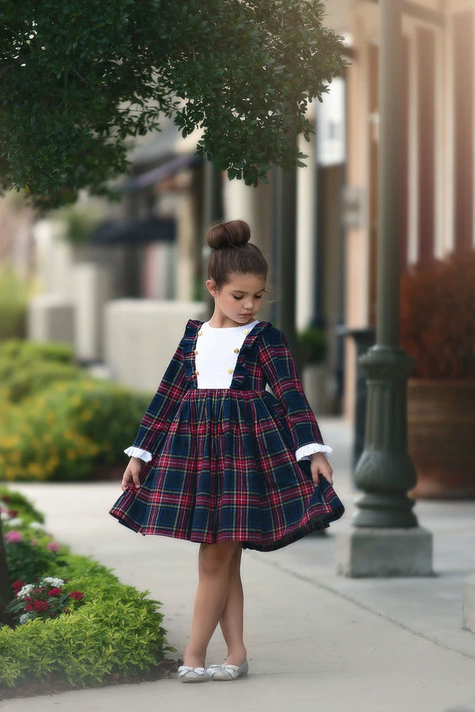 Ahhh the sweet traditions of a Stewart tartan dress…this classic holiday print, reinvented with a touch of whimsy, will be the talk of all your gatherings. The bodice is detailed with a white Swiss dot, finished off with regal crested gold buttons, fit for a gathering at Windsor castle. Truly a keepsake passed down from generation to generation. 100% soft brushed cotton, fully lined with soft cotton and back zips. Machine wash, hang dry.