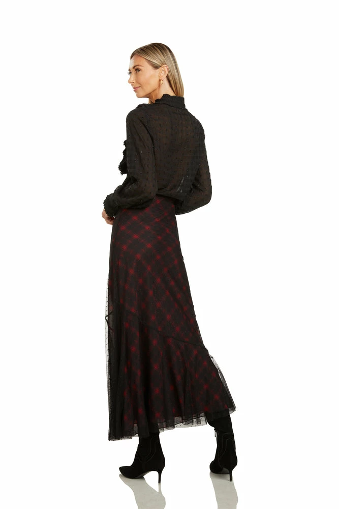 This elegant maxi skirt will be your go to skirt season after season! The tartan skirt is layered with a black dot mesh for just the right amount of movement.Â